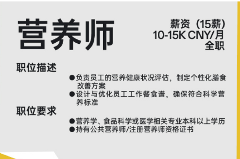 近日,知名影视自媒体“影视飓风”发布的一则招聘启事,意外登上热搜:他们正在以月薪1万至1.5万元,为全体员工招聘一位专职营养师。