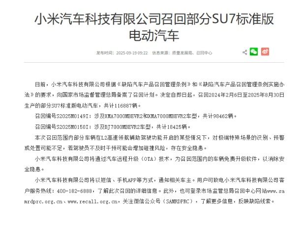 2025年9月19日,小米汽车科技有限公司向国家市场监督管理总局备案召回计划,宣布召回116,887辆SU7标准版电动汽车。这批生产于2024年2月至2025年8月的车辆,因L2高速领航辅助驾驶功能在“极端特殊场景下可能存在识别或处置不足”,需通过远程升级(OTA)消除隐患。